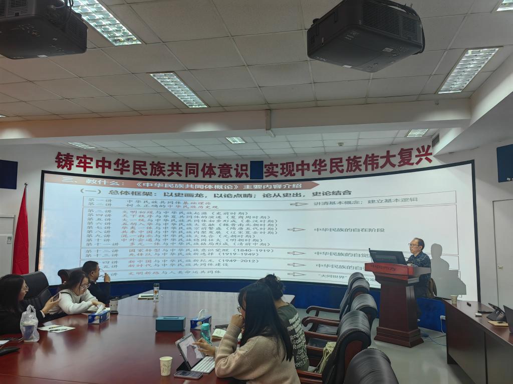 11月23日下午,中華民族共同體學(xué)院(研究院)姚上海教授以“慧眼看中華,概論話鑄牢”為主題,以課程邏輯與結(jié)構(gòu)體系為脈絡(luò),為中華民族共同體學(xué)院師生傾情講授《中華民族共同體概論(試用本)》(以下簡(jiǎn)稱《概論》),本次會(huì)議由學(xué)院黨總支書記賀展主持。