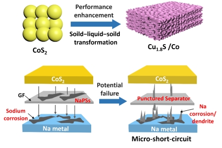 針對上述問題,該工作首次聚焦TMC在醚類電解液中的性能增強及電池失效現象,深入探索了其作用機制。以CoS2為研究對象,該工作發現CoS2在循環中發生CoS2→多硫化鈉(NaPSs)→Co/Cu1.8S不可逆相變,從而誘導電極形貌/結構的優化與重構,形成三維多孔網絡結構,促進儲鈉性能的增強。同時,NaPSs的形成引發了穿梭效應,造成Na金屬腐蝕及電池微短路,從而引起電池失效。隨后該工作通過電極電勢、理論計算系統探索了不同金屬硫化物的失效規律與機制。最后,該工作分別從材料層面和電池層面對電極進行修飾改性,使得電池的循環性能大幅增強(>1000圈)。該研究揭示了TMC基負極材料的電化學性能增強和失效機制,為TMC基材料的設計和優化提供了重要指導。