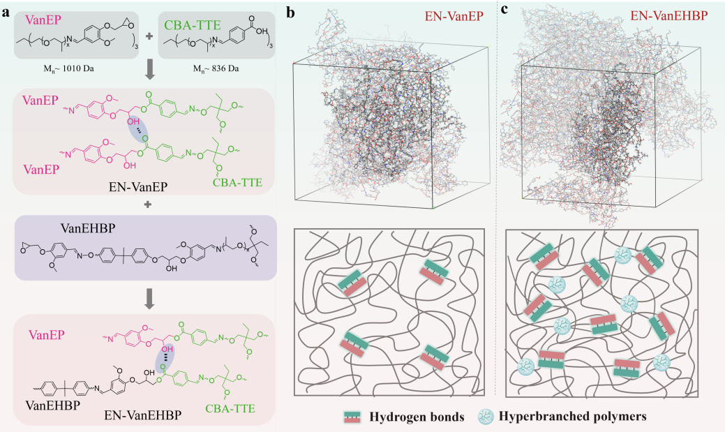 圖1.超分子環氧樹脂的內部分子間相互作用(a)和超分子網絡結構的分子動力學模擬(b- c)