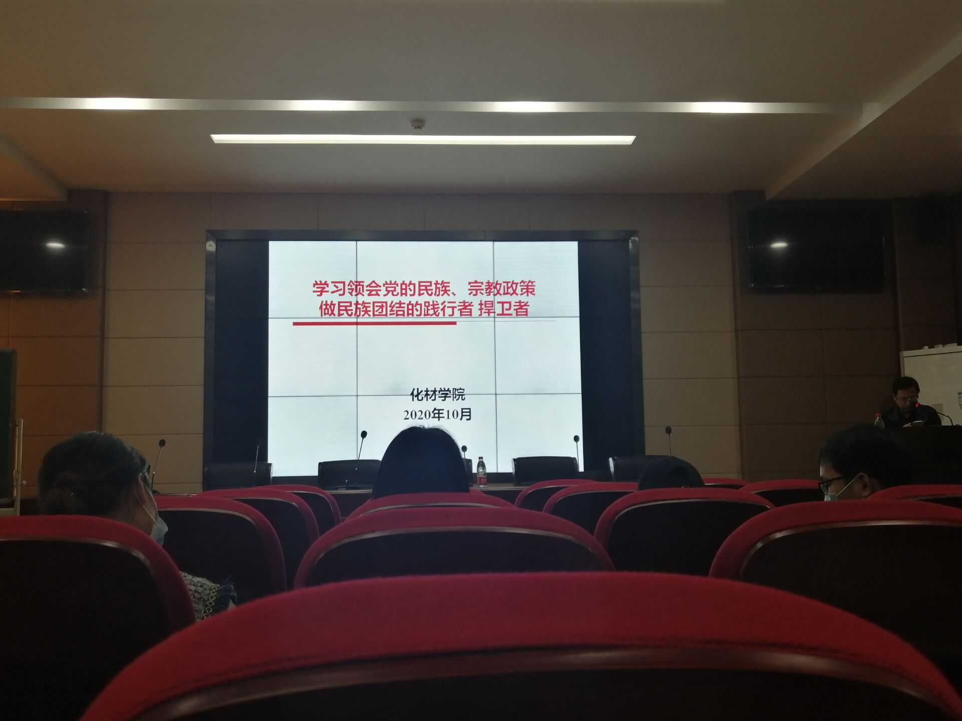 (記者:朱穎 通訊員:張菡潔)10月23日晚七點,我院黨員發展對象培訓班第二講在化材院大會議室舉行,本次黨課由學院黨委副書記郭暉主講。我院全體發展對象參會。本次黨課以“學習領會黨的民族政策,做民族團結的踐行者和捍衛者”為主題。