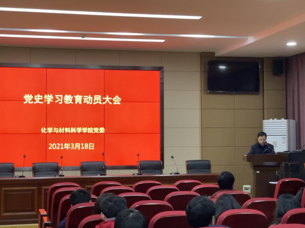 2021年3月18日下午,為深入學習貫徹習近平總書記在黨史學習教育大會上的重要講話精神,全面貫徹落實上級和學校黨委有關部署要求,學院黨委在化材院一樓大會議室召開黨史學習教育動員大會。學院黨政領導班子成員及各黨支部書記、學生黨員代表參會,黨委副書記郭暉同志主持會議。