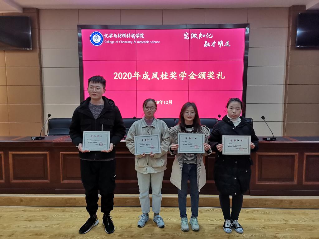 2020年12月16日下午,化學與材料科學學院在學院1樓會議室舉行了簡樸而隆重的成鳳桂獎學金頒獎典禮,為2019年和2020年獲得成鳳桂獎學金的學子們進行頒獎。學院副書記郭暉,輔導員及獲獎學生參會,楊夢瑩老師主持。
