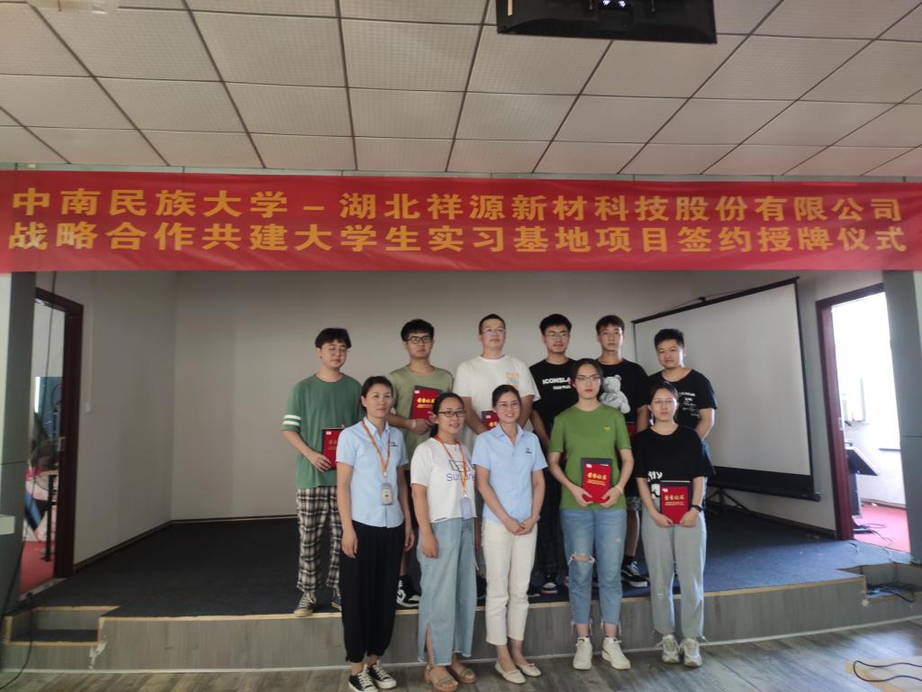 2021年7月19日,中南民族大學和湖北祥源新材科技股份有限公司隆重舉辦了戰略合作共建大學生實習基地項目簽約授牌儀式。出席儀式的有中南民族大學化學與材料學院鄧行書記、組織員張青、郭暉副書記及祥源新材各部門領導代表。會上,公司代表對中南民族大學師生一行表示熱烈歡迎和衷心感謝,并表示將以高度的責任感和使命感將祥源新材打造成一流的實習實踐基地。鄧行書記代表學校和學院對中南民族大學與祥源新材的合作表達了強烈信心,并對此次實習的學生提出了殷切的希望,希望大家實習期間深入企業,將理論知識與生產實踐相結合,更好的服務社會,成為社會主義現代化的建設者和接班人。