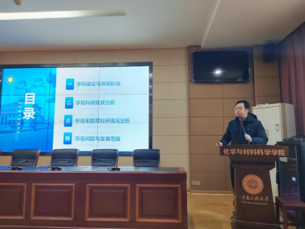 科研副院長(zhǎng)王立圍繞目前化學(xué)學(xué)科建設(shè)的現(xiàn)狀、發(fā)展目標(biāo)、青年教師整體情況以及面臨的挑戰(zhàn)等方面進(jìn)行了總結(jié)分析,系統(tǒng)梳理了在人才培養(yǎng)、科學(xué)研究、師資隊(duì)伍、社會(huì)服務(wù)、國(guó)際交流等方面優(yōu)勢(shì)與不足,就存在的問題和不足提出了建設(shè)舉措與發(fā)展思路。