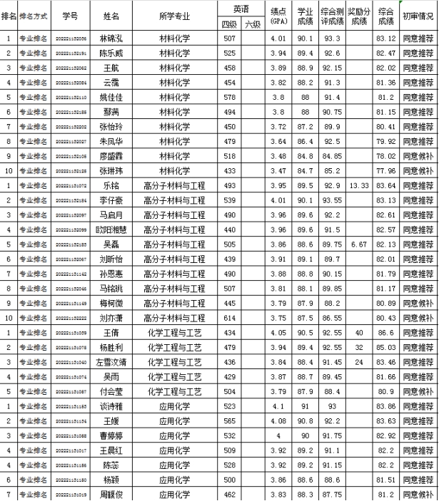 根據《中南民族大學推薦優秀應屆本科畢業生免試攻讀碩士學位研究生工作管理辦法(修訂)》(民大教學〔2024〕49號)、《關于做好推薦2026屆優秀本科畢業生免試攻讀碩士學位研究生工作的通知》《化學與材料科學學院關于推薦2026屆優秀本科畢業生免試攻讀碩士學位研究生實施細則》等相關文件的要求,經個人申請,學院推免工作領導小組評審,現將2026屆擬推薦和候補名單予以公示: