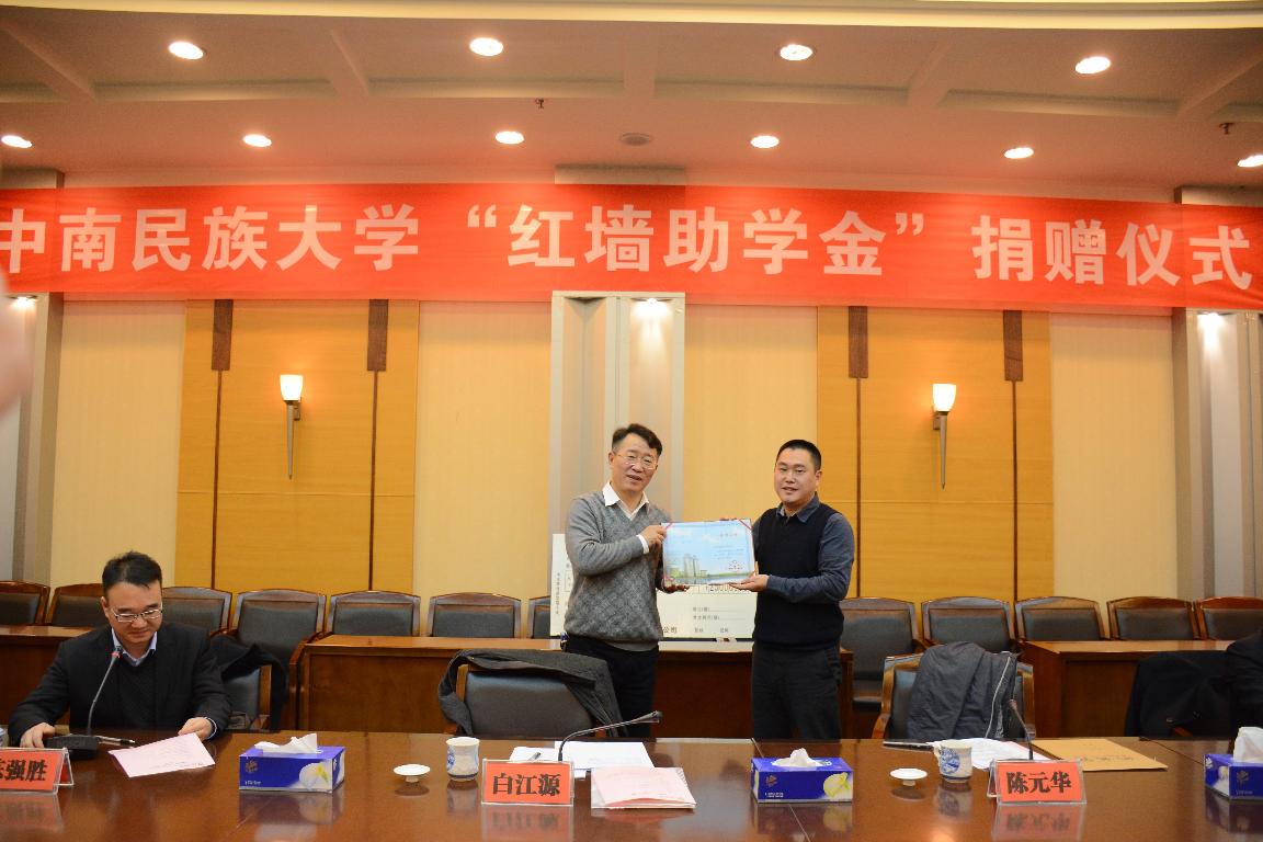12月5日上午, “紅墻助學金”中南民族大學捐贈儀式在學術交流中心隆重舉行。北京紅墻旅游控股有限公司董事長陳元華,我校1995級化學專業(yè)校友廖鋒,校黨委副書記白江源,學工部部長姚上海,以及人口較少民族學生代表參加了此次儀式。儀式由校基金會秘書長、校友會辦公室主任陳強勝主持。