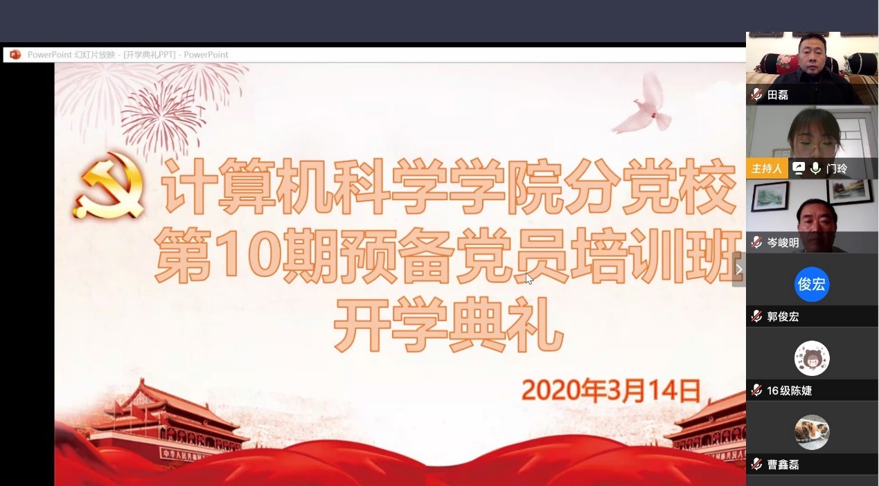 2020年3月14日下午兩點,依托網絡平臺,計算機科學學院成功舉辦2020年度預備黨員培訓班視頻開學典禮。學院黨委書記岑峻明、副書記田磊、本科生一支部黨支部書記王魏芳、本科生二支部黨支部書記張帆出席了本次活動。會議由培訓班跟班管理老師門玲主持。