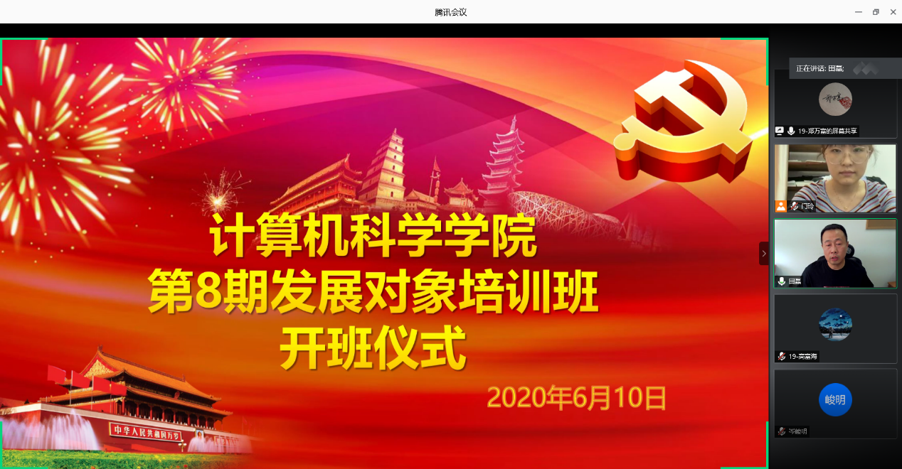 2020年6月10日下午四點,依托網(wǎng)絡(luò)平臺,計算機(jī)科學(xué)學(xué)院舉辦2020年度第八期發(fā)展對象培訓(xùn)班視頻開班典禮。學(xué)院黨委書記岑峻明、副書記田磊、2017級輔導(dǎo)員湯淵、2018級輔導(dǎo)員王夢莞、2019級輔導(dǎo)員楊曉磊出席了本次活動。會議由培訓(xùn)班班主任老師門玲主持。