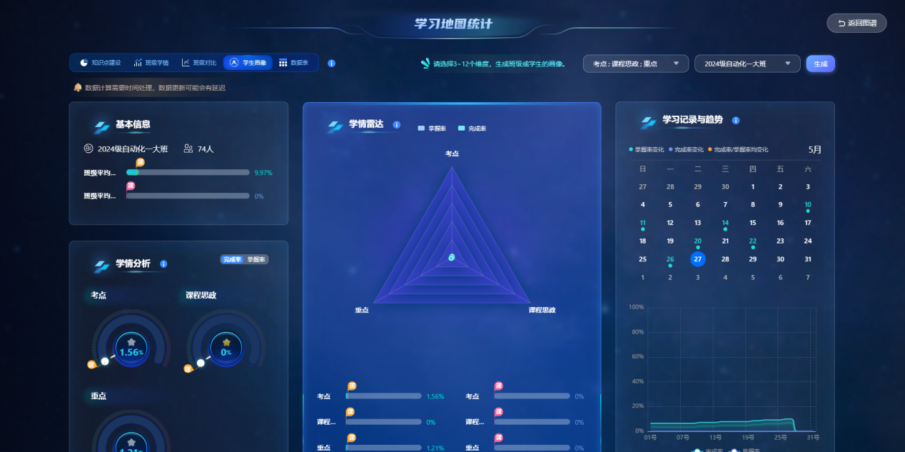 多維學(xué)習(xí)評(píng)估:數(shù)字化平臺(tái)實(shí)時(shí)量化學(xué)習(xí)進(jìn)度與效果,支持路徑回溯,助力學(xué)生查漏補(bǔ)缺。實(shí)行小組綜合性考核、成員之間互評(píng)創(chuàng)新型考核、平時(shí)考核與期末綜合考核相結(jié)合的模式,培養(yǎng)了團(tuán)隊(duì)合作精神,充分發(fā)揮過(guò)程管理的作業(yè),有效解決工程能力考核的難題。AI給學(xué)習(xí)過(guò)程畫像,給出過(guò)程評(píng)價(jià)和引導(dǎo)建議。