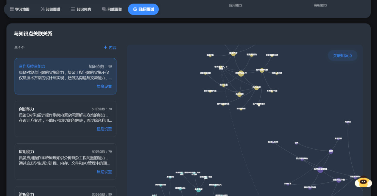 目標(biāo)圖譜:構(gòu)建“合作綜合能力-創(chuàng)新能力-應(yīng)用能力-辨析能力”四大模塊,優(yōu)化學(xué)習(xí)路徑,使得學(xué)習(xí)過(guò)程可控化,學(xué)習(xí)目標(biāo)透明化。