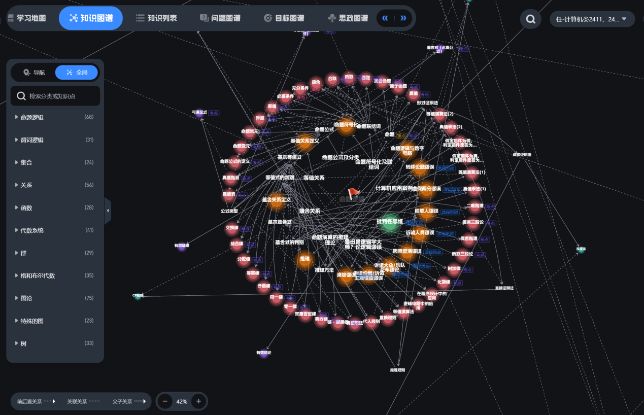 知識(shí)圖譜:將數(shù)理邏輯、集合論、關(guān)系與函數(shù)、格論、圖論等核心概念構(gòu)建為可探索的學(xué)習(xí)空間,通過(guò)400+知識(shí)點(diǎn)構(gòu)建完整體系,以邏輯鏈條構(gòu)建學(xué)習(xí)路徑,生成“能力雷達(dá)圖”,為每位學(xué)生定制命題邏輯、關(guān)系理論、圖論等專項(xiàng)“提升包”,并通過(guò)學(xué)習(xí)提醒推送,助力持續(xù)進(jìn)步。