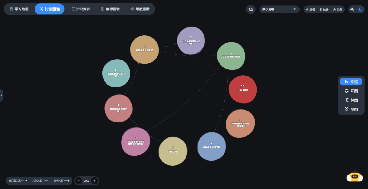 模塊化知識(shí)圖譜:將課程教學(xué)內(nèi)容按照“零件-部件-系統(tǒng)”的模塊化,逐層深入地重構(gòu)了教學(xué)內(nèi)容。涵蓋電路定律、電路化簡(jiǎn)與分析、交流穩(wěn)態(tài)電路、動(dòng)態(tài)過(guò)程分析等10大模塊,清晰呈現(xiàn)知識(shí)點(diǎn)間的邏輯路徑,幫助學(xué)生構(gòu)建系統(tǒng)化認(rèn)知。通過(guò)樹狀結(jié)構(gòu)(章-節(jié)-知識(shí)點(diǎn))清晰展示206個(gè)知識(shí)點(diǎn)的邏輯路徑,幫助學(xué)生構(gòu)建系統(tǒng)化認(rèn)知。融入電磁兼容、仿真軟件等工程拓展內(nèi)容,形成“基礎(chǔ)理論-工程應(yīng)用”雙主線結(jié)構(gòu),支持知識(shí)點(diǎn)拖曳交互與邏輯關(guān)系可視化。