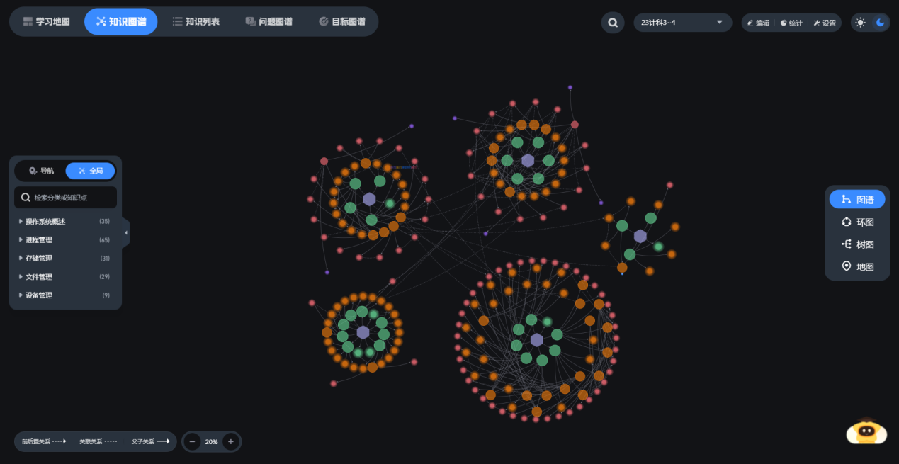知識(shí)圖譜:作為計(jì)算機(jī)學(xué)科各專業(yè)的核心必修課,《操作系統(tǒng)原理》是探索計(jì)算機(jī)系統(tǒng)運(yùn)行邏輯的“鑰匙”。《操作系統(tǒng)原理》課程構(gòu)建了進(jìn)程管理、內(nèi)存管理等五大知識(shí)模塊,圍繞考研大綱重構(gòu)設(shè)計(jì)了100+個(gè)知識(shí)點(diǎn)。借助知識(shí)圖譜,學(xué)生可以厘清知識(shí)間的邏輯關(guān)系,進(jìn)而自定義學(xué)習(xí)路徑,精準(zhǔn)突破重點(diǎn)和難點(diǎn)。