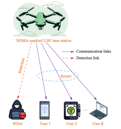 林士勝以核心成員身份參與研究的論文“Secure and robust power allocation for covert UAV-aided IoT networks using NOMA”(發(fā)表于Chinese Journal of Aeronautics),聚焦無(wú)人機(jī)輔助物聯(lián)網(wǎng)網(wǎng)絡(luò)的安全與可靠性難題。針對(duì)信道狀態(tài)信息不完美、存在潛在竊聽(tīng)者的場(chǎng)景,提出最優(yōu)功率分配算法,有效提升了無(wú)人機(jī)輔助系統(tǒng)的隱蔽通信能力與穩(wěn)健性,為物聯(lián)網(wǎng)安全通信提供了新方案(如圖1)。