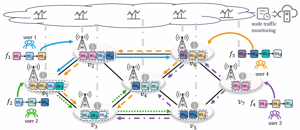 陳洋助力完成的論文“Intelligent autoscaling of microservice and request routing for dynamic service requests”(發(fā)表于IEEE Internet of Things Journal),針對(duì)移動(dòng)邊緣計(jì)算中微服務(wù)動(dòng)態(tài)部署難題,構(gòu)建請(qǐng)求路由與實(shí)例伸縮聯(lián)合優(yōu)化模型,實(shí)現(xiàn)了時(shí)延約束下的部署成本最小化,為高并發(fā)場(chǎng)景下的網(wǎng)絡(luò)服務(wù)質(zhì)量保障提供新路徑(如圖3)。