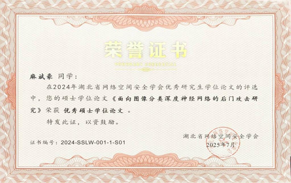 我院研究生麻斌豪獲湖北省網絡空間安全學會優秀碩士學位論文