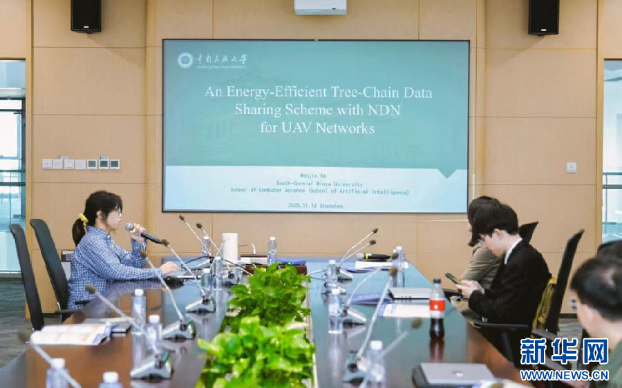 圖為學(xué)院碩士研究生柯文杰在第十六屆IEEE CloudCom國際會議匯報現(xiàn)場 中南民族大學(xué)供圖