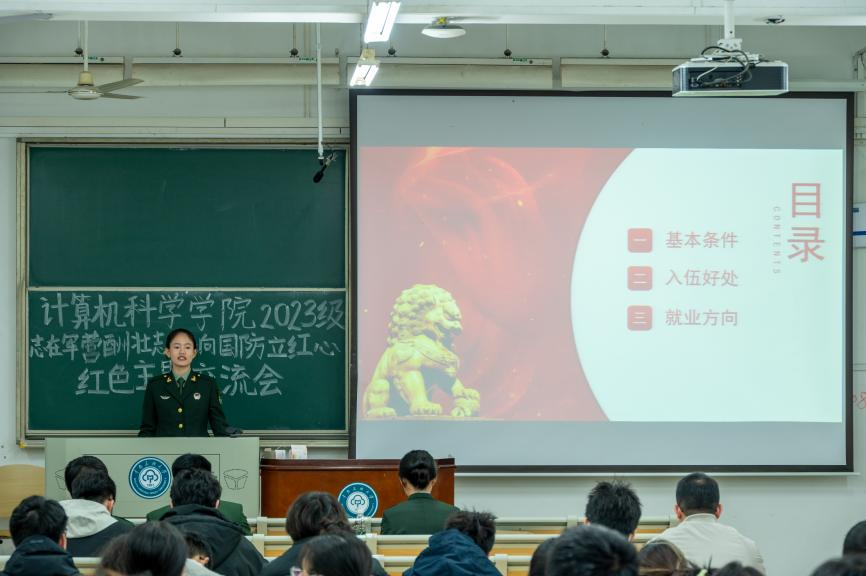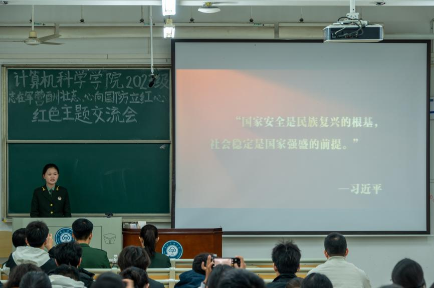 攜筆從戎勇擔強軍重任,綠色軍營書寫絢爛青春。為積極響應強國強軍號召,激發我院學子參軍報國的熱情,計算機科學學院2023級于2024年11月29日晚上在11號教學樓207教室召開“志在軍營酬壯志,心向國防立紅心”紅色主題交流會,旨在通過國防交流激發學院學生投身軍營,報效祖國的激情與熱情,參與此次交流會的有計算機科學學院2023級本科生輔導員蘇志俊老師、國防教育學生工作委員會國防教育宣講團成員以及我院2023級120余名學生,交流會由院文工團主持組組長朱家瑜主持。