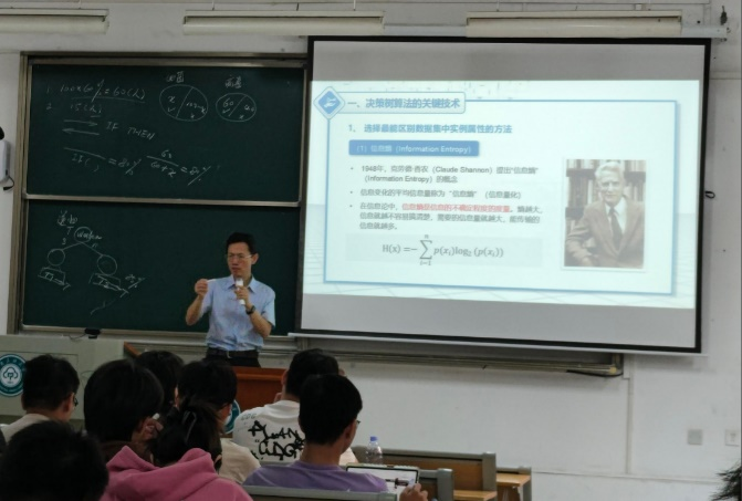 李波老師本次課程以《數據挖掘導論》的第2章“決策樹”為主題開展講解和討論。在講到決策樹C4.5算法時,李波老師介紹了C4.5算法用到的一個重要指標-增益率,并介紹了增益率的計算原理,該指標來源于信息論學科的一個重要概念-信息熵。李波老師通過一個科學小故事介紹了著名科學家香農如何提出信息熵的過程,信息熵的提出是香農做出的一個開創性貢獻。李老師引導同學們認識在科學研究中勤于思考、勇于創新的重要性,并通過“信息熵”和熱力學中“熵”的概念的比較,鼓勵同學們在科學研究中要富有創新思維和想象力。隨后,李老師問同學們,中國科學家有沒有在信息科學和計算機科學領域在世界也做出了開創性貢獻的代表?然后提到清華大學教授姚期智先生,姚先生在偽隨機數生成、密碼學與通信復雜度等方面做出了開創性貢獻,并獲得了圖靈獎。李波老師隨后向同學們展示了習近平總書記在姚期智先生回清華大學任教20周年的回信。李老師鼓勵同學們努力學習,勇于擔當,為解決計算機領域的“卡脖子”技術問題、實現中華民族科技自立自強、努力建設和實現科技強國做出自己的應有貢獻。