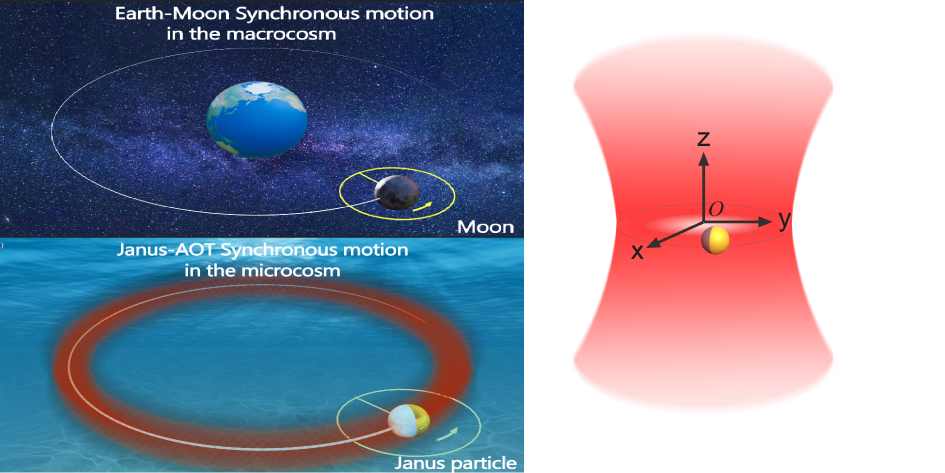 月球-地球同步轉(zhuǎn)動備受關(guān)注,被普遍認為是潮汐鎖定效應的結(jié)果。然而,在微觀世界中,如此獨特的地月同步轉(zhuǎn)動極為罕見且難以觀測。我校計算機科學學院劉靜老師與華南理工大學李志遠教授、中央民族大學郭紅蓮教授和華南理工大學龍利博士合作,研究利用紅外激光束和錐透鏡構(gòu)成環(huán)形光阱,制備具有不對稱結(jié)構(gòu)的Janus粒子,成功捕獲并觀察到Janus粒子在環(huán)形光阱(Annular Optical Trap,AOT)中同步轉(zhuǎn)動。Janus粒子所受力和力矩與其位置和取向高度耦合,自驅(qū)動地進行平動和轉(zhuǎn)動,揭示了微觀世界中“月球效應”。