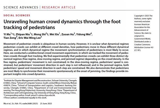近日,中南民族大學計算機學院(人工智能學院)施朦副教授在行人交通流領域取得重要研究進展。其研究論文“Unraveling human crowd dynamics through the foot tracking of pedestrians”發表在國際前沿期刊《Science Advances》上。該研究通過追蹤行人步態,深入揭示行人在人流中移動時如何根據感知到的環境信息調節運動速度、方向及步態的問題,為研究人群動態提供重要見解。這是我院首次在Science子刊《Science Advances》發表文章,施朦副教授為本文共同第一作者。