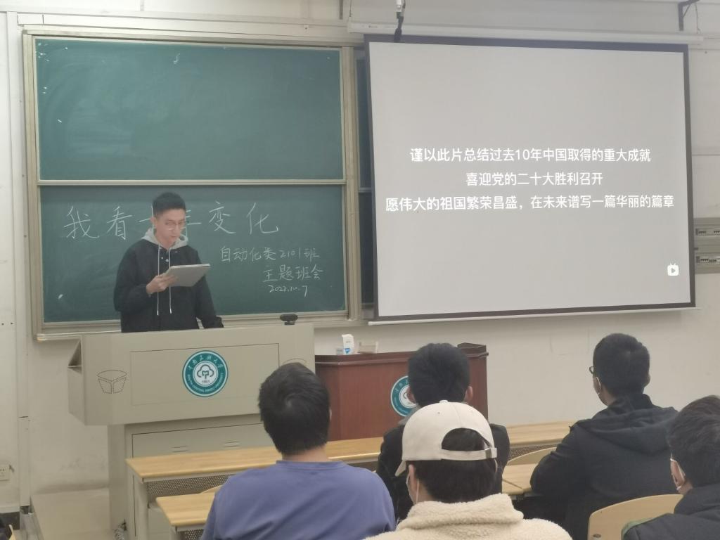 會上各班同學(xué)回顧往昔,從國際局勢變化到國內(nèi)各方面發(fā)展再到個人生活的改變,展開熱烈討論。自動化類2105班從四川大涼山“懸崖村”的十年變化引出中國十年變化,以觀看“中國十年變化”系列視頻的形式向同學(xué)們展示了十年來我國在各個方面取得的偉大成就。計算機類2108班從祖國整體變化和家鄉(xiāng)具體變化兩個方面分析,總結(jié)出這十年對于人民來說意義非凡。機械2101班介紹了國家民生、經(jīng)濟、科技、生態(tài)的變化,同學(xué)們對祖國的日益強大表達(dá)出強烈的自豪與驕傲。