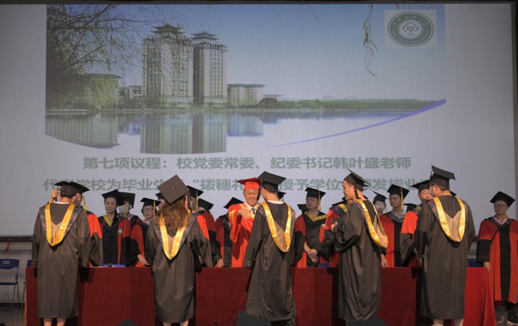 計算機科學學院院長覃俊宣讀了學士學位授予決定。之后進行了學士學位授予儀式,校黨委常委、紀委書記韓葉盛與出席的院領導一起為畢業生行撥穗禮并合影留念。全體畢業生向臺上就座的班導師及教師代表鞠躬致意,并依次與老師們一一握手,再次感謝了各位老師四年來對同學們的教育、關心和陪伴。