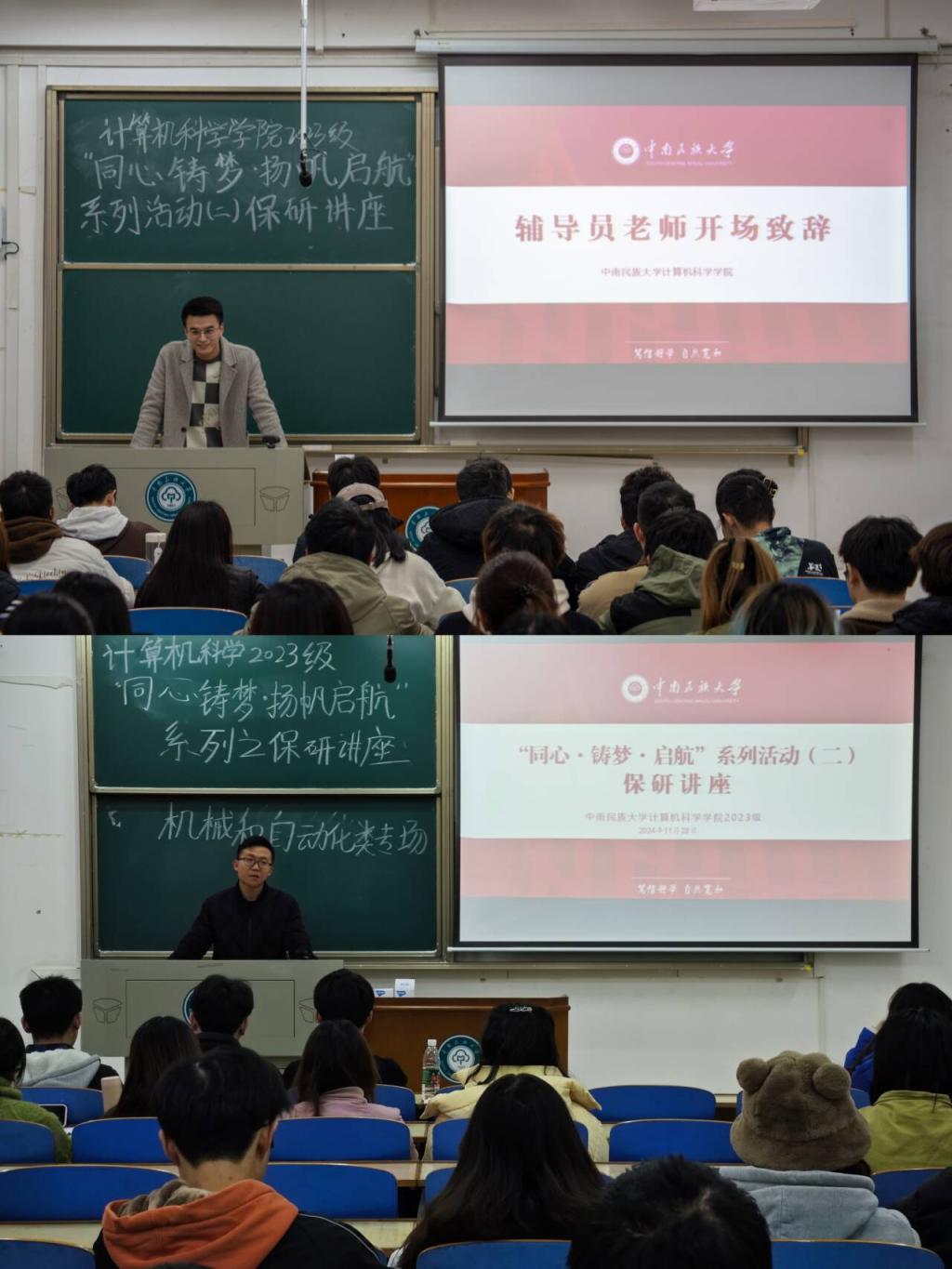 為加強學習經(jīng)驗交流,打造平臺,營造“比學趕超、創(chuàng)先爭優(yōu)”的學習氛圍,進一步引導同學們提升職業(yè)規(guī)劃意識,明確大學奮斗目標,2024年11月28日19:00-20:30,計算機科學學院2023級年級團總支學生會在15號教學樓417教室(計算機類專場)、418教室(機械和自動化類專場)成功舉辦“同心鑄夢·揚帆啟航”系列活動(二)——保研分享交流會,交流會邀請2021級成功保研的優(yōu)秀學生彭泰、張博雅、李蘇婷、潘彤、王昊、于明宇、金芮慷與趙博文進行經(jīng)驗分享,吸引了數(shù)百名同學積極參與,2023級輔導員沈易軍、蘇志俊參加。