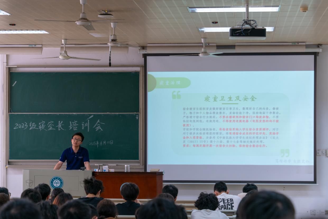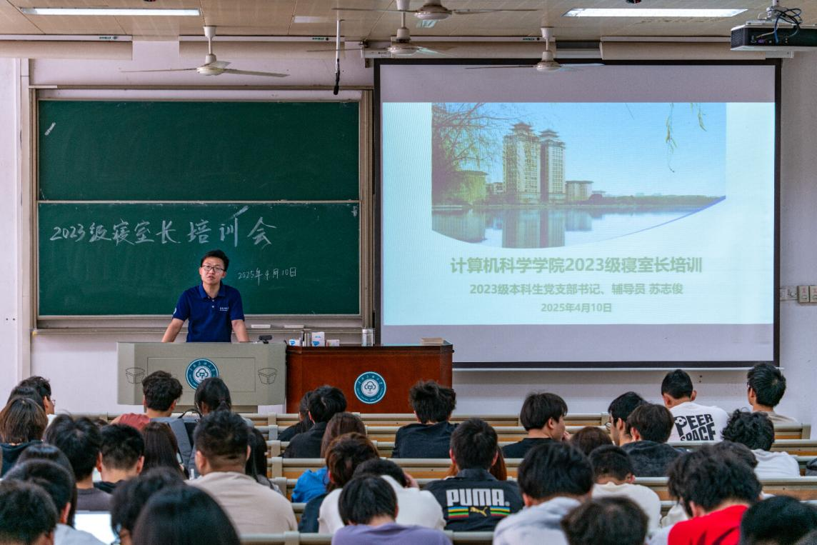為建強寢室長隊伍,提升學生骨干履職盡責能力,系統推進平安校園建設,4月10日中午,計算機科學學院在11棟100教室舉辦2023級寢室長培訓會,培訓會由2023級本科生黨支部書記、輔導員蘇志俊主講,2023級約150余名寢室長、生活委員參加。