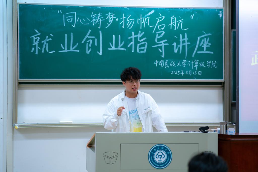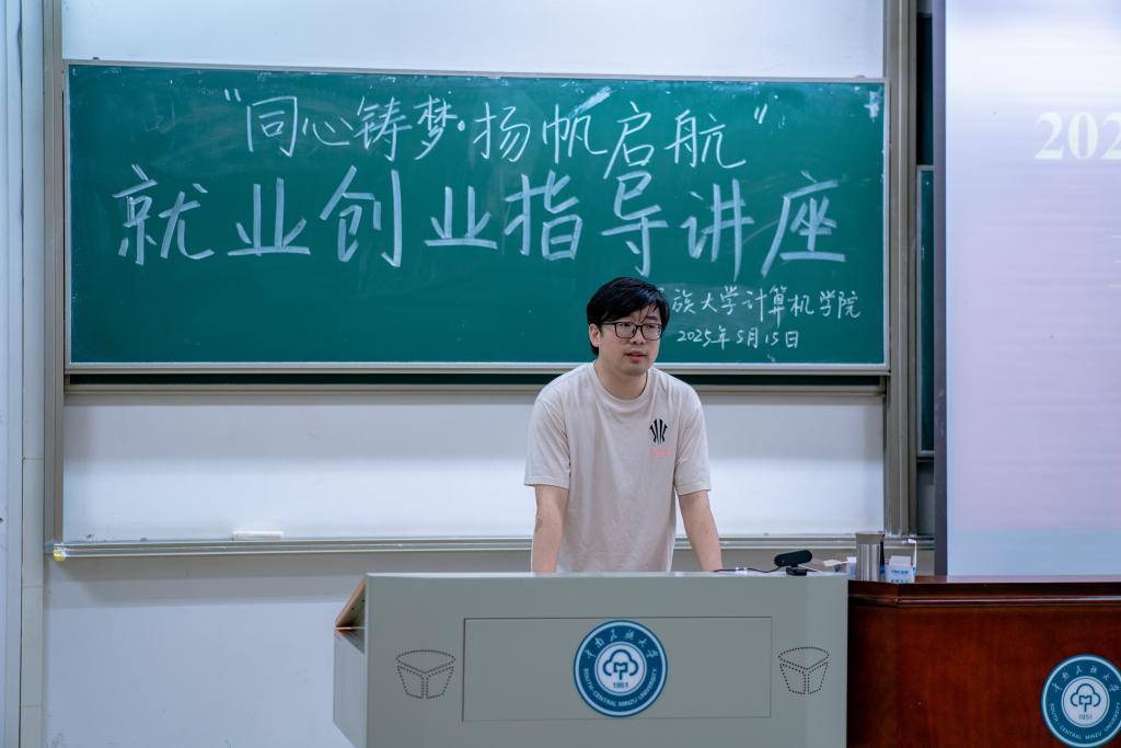 為引導同學們盡早明確未來職業目標,做好職業生涯規劃,樹立就業擇業觀念,提升就業核心競爭力,2025年5月15日,計算機學院(人工智能學院)2023級團總支學生會在11棟100教室召開“同心鑄夢·揚帆啟航”主題系列活動(三)——就業創業指導講座,講座邀請兩位2023屆軟件工程專業優秀畢業生李宗遇、袁聲作經驗交流分享,吸引了數百名同學積極參與。講座由陳斯翰同學主持,2023級輔導員蘇志俊和沈易軍參加。