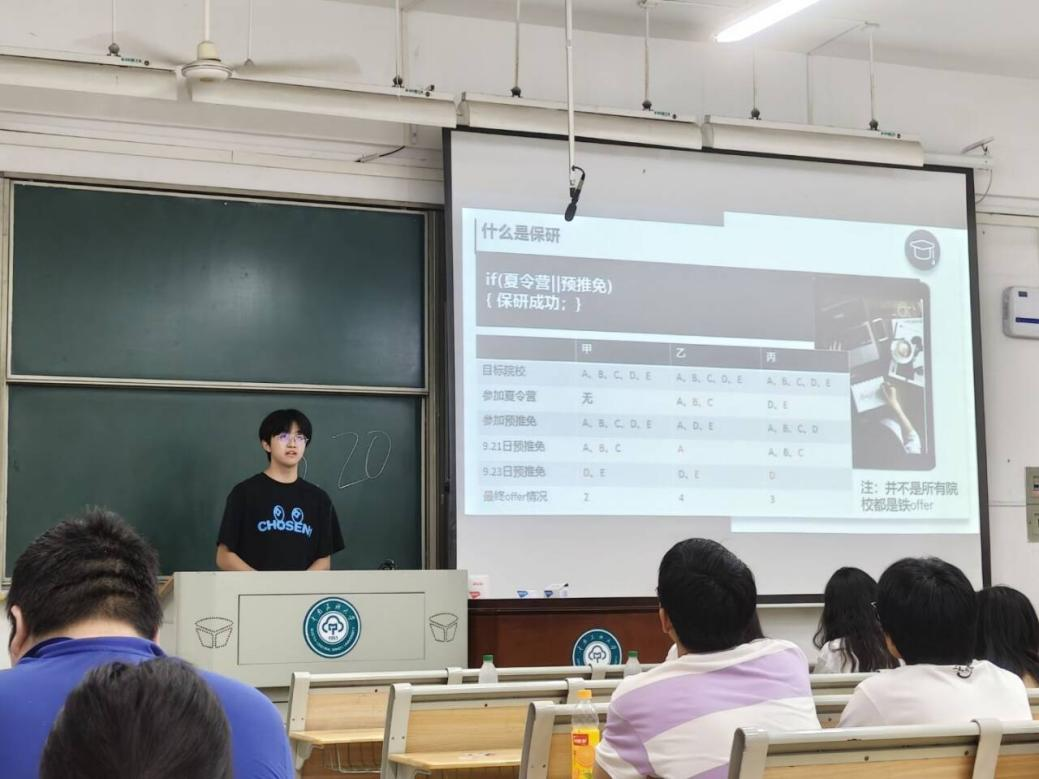 彭泰學(xué)長(zhǎng)以“保研經(jīng)驗(yàn)分享”為主題分享寶貴經(jīng)驗(yàn),他表示,保研的核心在于日常學(xué)習(xí)成績(jī)的積累,建議同學(xué)們要提前規(guī)劃,盡早關(guān)注目標(biāo)院校的保研政策和時(shí)間線,同時(shí),他認(rèn)為本科期間積累科研項(xiàng)目經(jīng)歷十分重要,鼓勵(lì)同學(xué)們積極參加科研項(xiàng)目,提升科研創(chuàng)新能力,定期與導(dǎo)師保持“雙向奔赴”的良性溝通,并分享實(shí)用的資料收集方法和面試技巧。