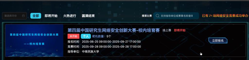 本次校內培育賽由武漢黃鶴網絡安全實驗室指導,中南民族大學計算機學院(人工智能學院)主辦,以“筑牢信息安全防線,培育實戰化人才”為目標,分階段推進賽事組織工作。6月25日9:00,賽事正式啟動報名,至9月27日17:00 報名結束,吸引了該校眾多研究生踴躍參與;9月28日9:00 至17:00,實網對抗賽在指定線上競賽平臺如期舉行,參賽選手展現了扎實的技術功底與良好的協作能力。