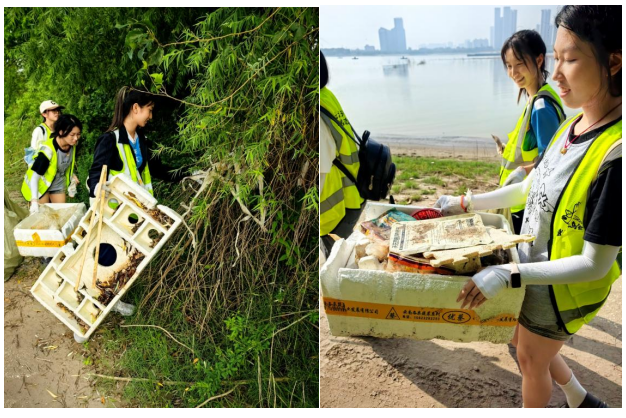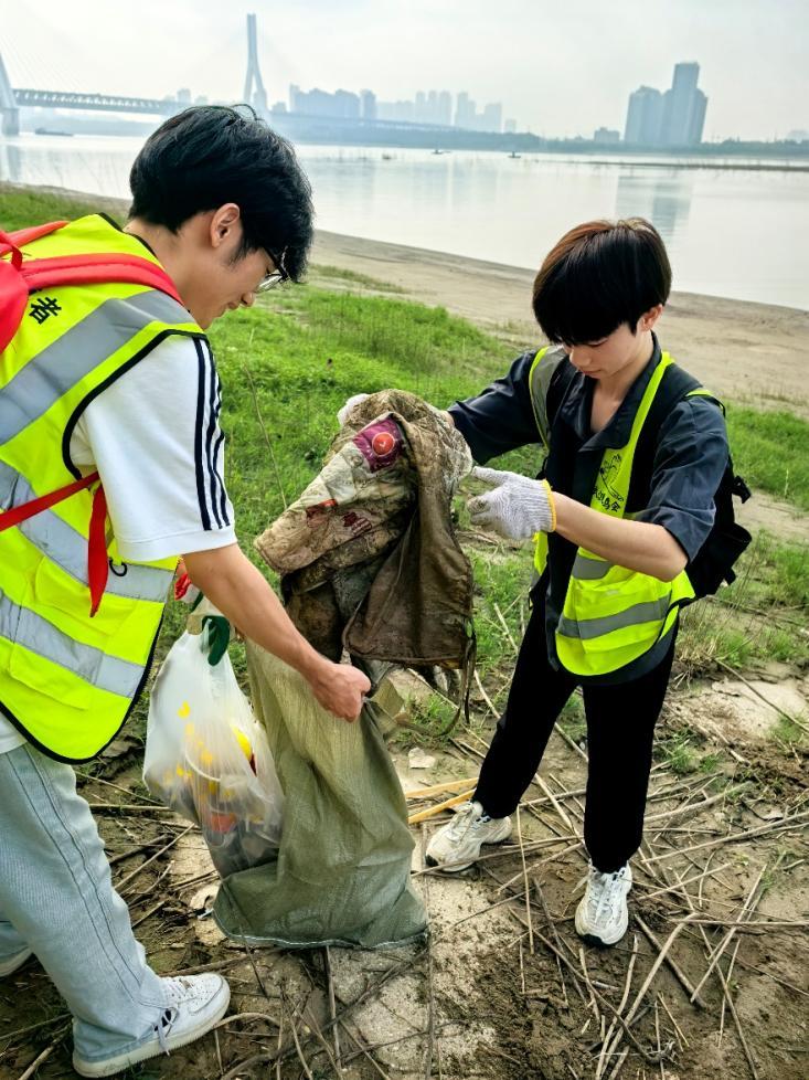 在撿拾垃圾的間歇,同學們充分感受到“人與自然和諧共生”的美麗畫卷——不遠處幾只白鷺在江水退去后的灘涂上閑庭信步,三兩只灰頭麥雞也不時加入它們。經過一個小時的清理,5只蛇皮袋裝得滿滿,被運往天興洲鄉政府指定的垃圾集中處理點。
