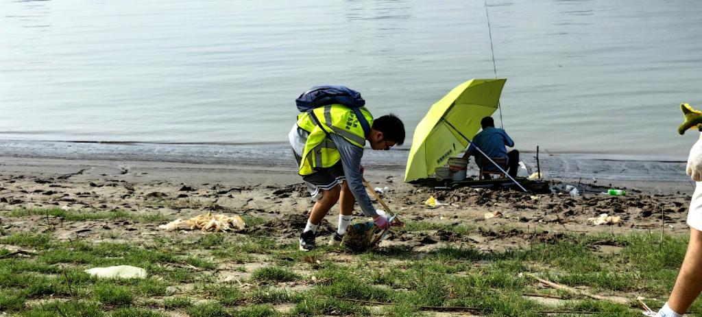 大堤旁的垃圾裹著泥沙,被同學們撿拾收集 楊波攝