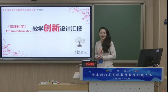 比賽中,韓曉樂老師匯報的課程是《物理化學》,她從課程的基本情況、痛難點分析入手,進一步闡釋教學創新理念和教學設計,結合教學活動的開展,對教學成效進行了全面、客觀的分析。
