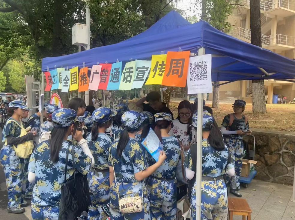 在校園內懸掛橫幅、張貼海報、擺放展板,營造推普周濃厚氛圍。制作推普主題宣傳冊,累計發放 2000 余份,向全校師生普及國家通用語言文字小知識。在教務處官微推送推普宣傳海報和公益廣告視頻,線上、線下全方位覆蓋。9 月 18 日至 20 日在南區一二食堂之間開展推普現場展臺活動,鼓勵廣大同學參與轉發推文集贊兌獎活動,吸引了眾多同學前來線下展臺參與活動,在校園內形成了濃厚的“講普通話,寫規范字”的學習氛圍,讓“說普通話、寫規范字”成為新生進入大學的第一課。