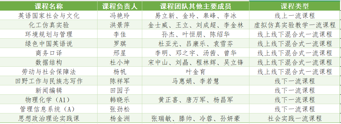 入選課程覆蓋五大類課程類型,其中線上線下混合式一流課程5門、線下一流課程4門、線上一流課程1門、虛擬仿真實驗教學一流課程1門、社會實踐一流課程1門。