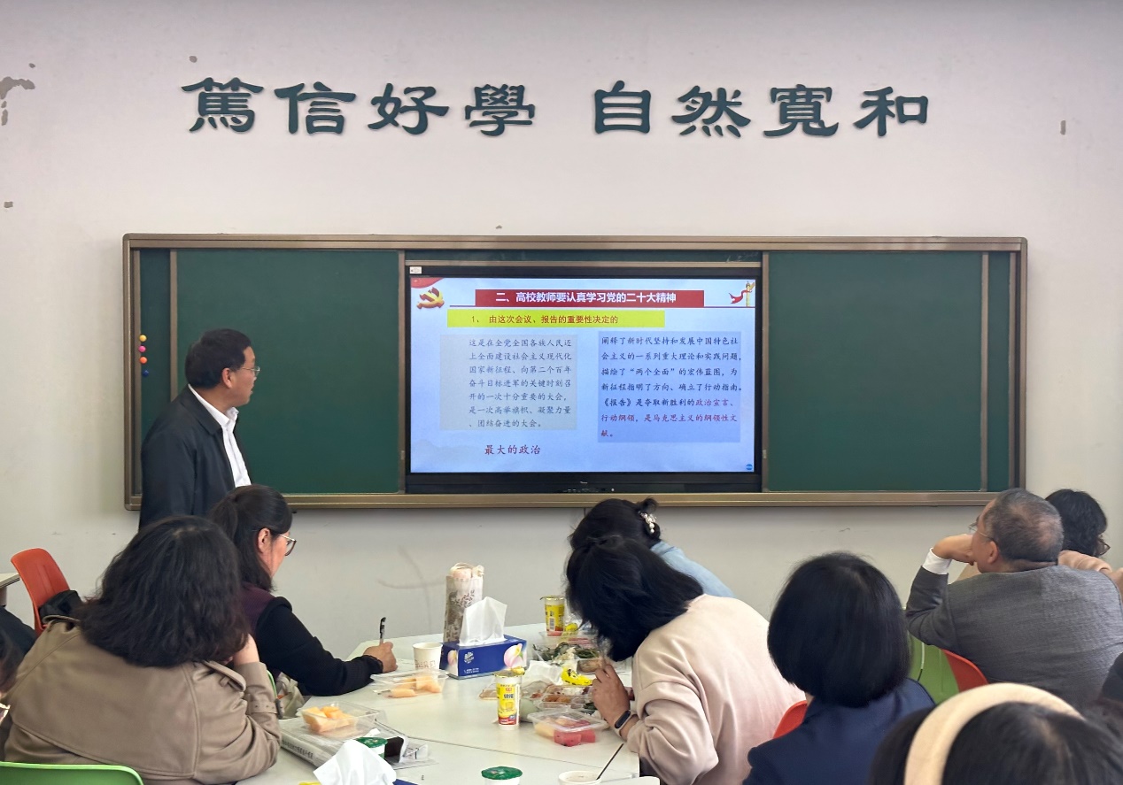 閻教授簡要回顧了黨的二十大重要成果,從政治要求、社會主義大學性質、功能與根本任務、大學教師職業要求等四個方面闡明了黨的二十大精神融入教育教學的重要性與必要性,重點分析了黨的二十大報告與各學科之間的融入點、融入渠道和融入方法。閻教授指出,高校教師應學深悟透篤行黨的二十大報告核心要義,結合學科專業特點,找準著力點全面精準地將黨的二十大精神融入課堂、融入教學、融入人才培養中。