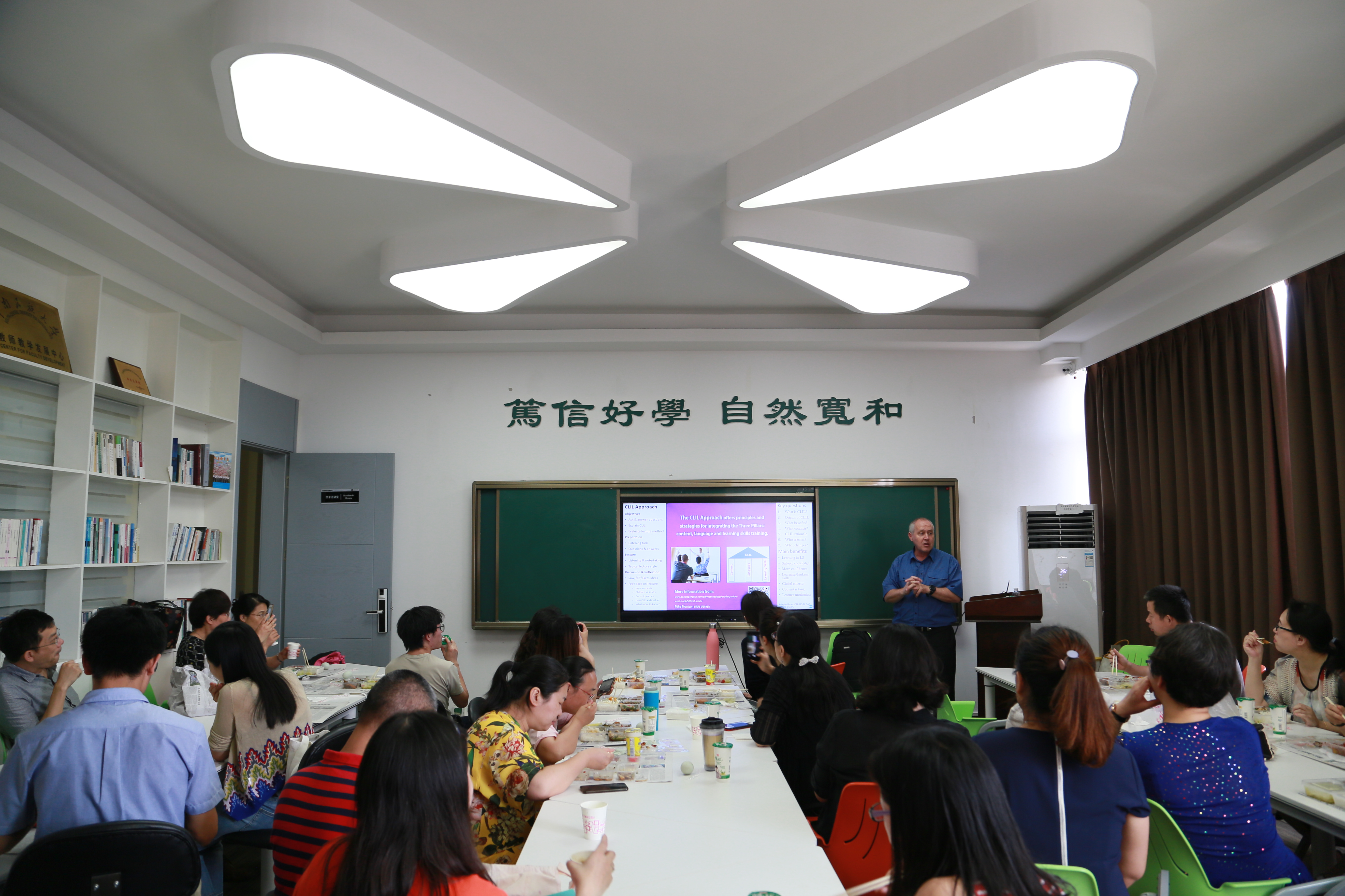 6月25日,教師教學(xué)發(fā)展中心舉辦了第71期教學(xué)學(xué)術(shù)午餐會。本次活動特邀澳大利亞昆士蘭大學(xué)Garry Austin教授為主持人,主題為“雙語教學(xué)中的重點(diǎn)與難點(diǎn)問題”,我校近40名教師參與了此次活動。 首先,Austin教授從CLIL教學(xué)法、CLIL的基礎(chǔ)、調(diào)整書面材料、教學(xué)活動設(shè)計、學(xué)習(xí)者模式、教學(xué)任務(wù)設(shè)計、體驗(yàn)式學(xué)習(xí)循環(huán)、培養(yǎng)思辨能力、語言的地位及CLIL矩陣以等多個方面介紹了雙語教學(xué)應(yīng)注意的事項(xiàng)。在交流討論環(huán)節(jié),老師們就雙語教學(xué)問題與Austin教授展開積極研討,如,計算機(jī)科學(xué)學(xué)院的樊金榮副教授對CLIL教學(xué)法中的內(nèi)容、語言、技巧三者的重要性提出了疑問,她認(rèn)為技巧是CLIL教學(xué)法中是最重要的,并給出了她的理解,Austin教授則認(rèn)為,Content is the King,內(nèi)容才是核心,針對這一問題,與會老師們紛紛各抒己見,展開了激烈的討論;法學(xué)院的朱春華老師對于自己口語能力能否勝任雙語課堂教學(xué)存在一些顧慮,Austin教授鼓勵了他,認(rèn)為他已經(jīng)具備了一定的口語能力,可以勝任雙語課堂,他應(yīng)當(dāng)先建立起自信。最后,Austin教授指出,教師的干預(yù)對學(xué)生的學(xué)習(xí)效果會產(chǎn)生較大影響,尤其是對那些自身功底不足且學(xué)習(xí)能力較差的學(xué)生,因此,教師應(yīng)該以學(xué)生為中心,多鼓勵、多鞭策,讓學(xué)生對雙語課堂充滿興趣和信心。