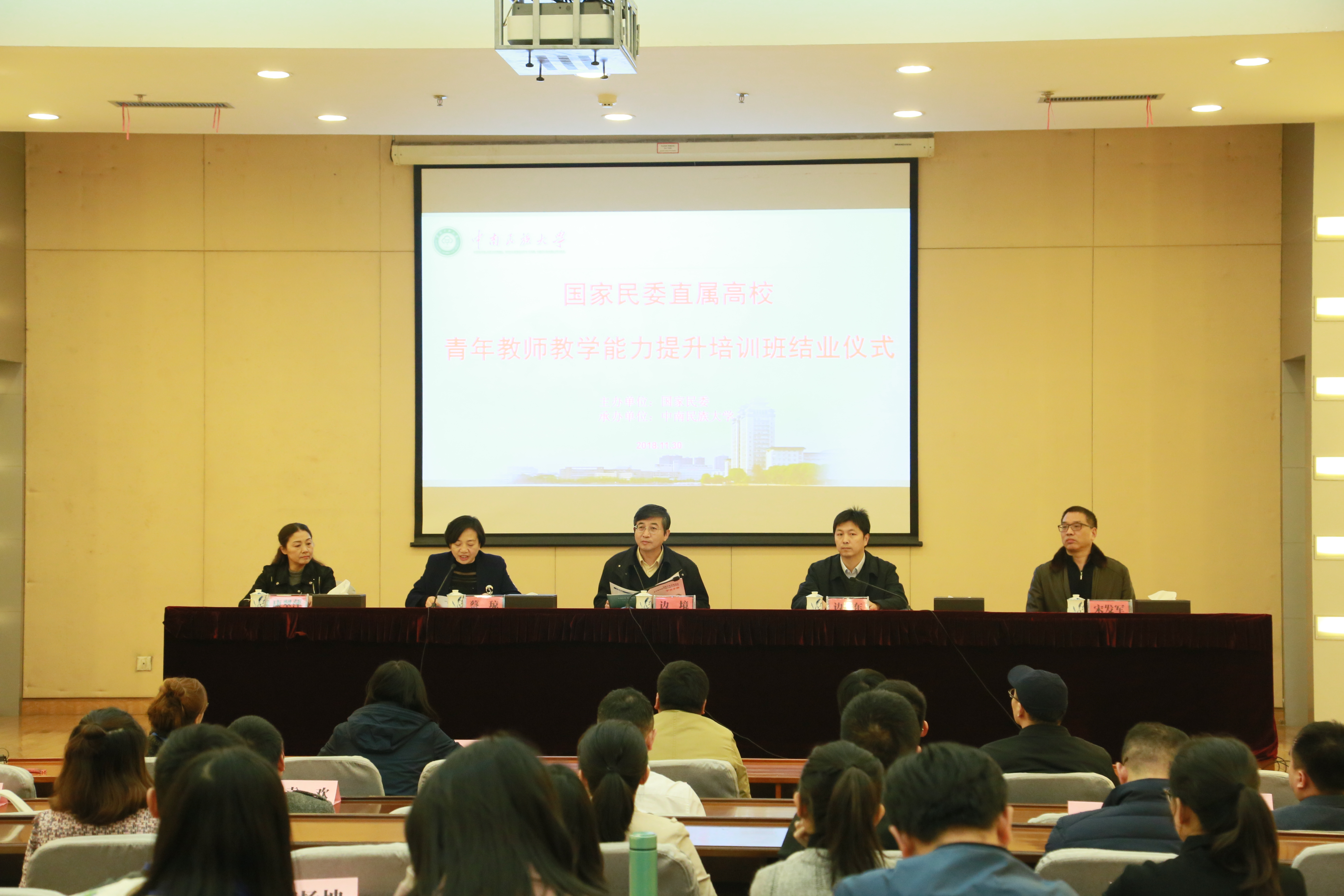西南民族大學(xué)鄧添予、西北民族大學(xué)黃洪猛、我校韓曉樂老師作為學(xué)員代表發(fā)言,從思想、技能、情感等方面總結(jié)了培訓(xùn)的收獲,并從自己的學(xué)習(xí)體會的角度提出了相關(guān)建議。他們表示,要堅持立德樹人為根本,牢記新時代民族高校教師的特殊使命,不斷提高教育教學(xué)質(zhì)量。 邊旭東強調(diào)了首次舉辦國家民委直屬高校青年教師教學(xué)能力提升培訓(xùn)班的重要意義,肯定了此次培訓(xùn)班的成功舉辦以及各委屬高校人才隊伍建設(shè)方面取得的重要進展。他希望參加培訓(xùn)的青年教師不斷提升自身能力,并分享此次受訓(xùn)心得,共同推進委屬高校人才隊伍持續(xù)健康發(fā)展,為民族高等教學(xué)事業(yè)提供堅強人才保障和智力支撐。 邊境從組織領(lǐng)導(dǎo)、師資內(nèi)容、紀(jì)律學(xué)風(fēng)等方面對此次培訓(xùn)活動作了總結(jié)。他指出,本期培訓(xùn)班不僅提升了青年教師的教學(xué)能力,同時加強了民族院校間的交流。他強調(diào),青年教師責(zé)任重大,使命光榮,要打好政治基礎(chǔ)、思想基礎(chǔ)、業(yè)務(wù)基礎(chǔ)和作風(fēng)基礎(chǔ),做到政治過硬、身帶正能量、一心為學(xué)生。他還就今后相關(guān)培訓(xùn)工作對職能部門提出了工作要求,并表示學(xué)校會更加關(guān)注對青年教師的培養(yǎng),努力辦好人民滿意的民族高等教育。  與會領(lǐng)導(dǎo)為培訓(xùn)班青年教師頒發(fā)了結(jié)業(yè)證書。