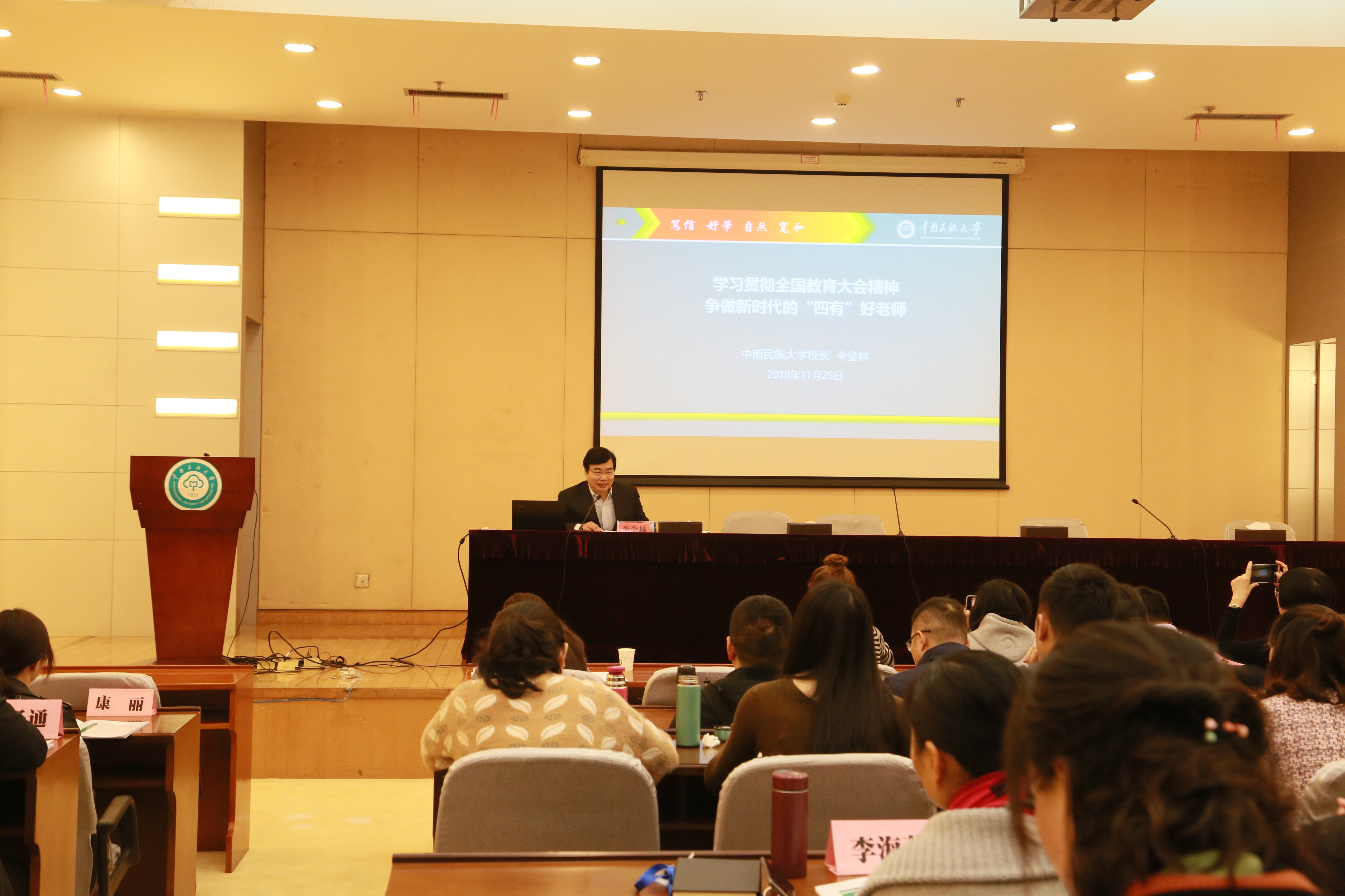 中央民族大學(xué)楊毛措老師作為學(xué)員代表發(fā)言,感謝國家民委和中南民族大學(xué)提供的學(xué)習(xí)機會。她表示,培訓(xùn)期間將虛心求教、遵守紀(jì)律、積極參加班級各項活動,不斷提升自己的教學(xué)能力和綜合素質(zhì)。 李金林在講話中指出,青年教師是學(xué)校的后備力量,其成長關(guān)系到學(xué)校的未來與發(fā)展。他從認(rèn)識到位、認(rèn)真學(xué)習(xí)、加強交流、學(xué)以致用、嚴(yán)守紀(jì)律五個方面向?qū)W員們提出了期望與要求,希望大家切實提高政治站位,緊密結(jié)合教學(xué)實際,學(xué)用結(jié)合,學(xué)深悟透,在相互交流中學(xué)有所獲,更快成長為優(yōu)秀教師。 本期培訓(xùn)班由中南民族大學(xué)教師教學(xué)發(fā)展中心具體承辦。培訓(xùn)班共邀請來自武漢大學(xué)、華中科技大學(xué)、華中師范大學(xué)、中山大學(xué)、中南民族大學(xué)的11位知名專家學(xué)者分別作了《學(xué)習(xí)貫徹全國教育大會精神,爭做新時代的“四有”好教師》、《在引導(dǎo)大學(xué)生健康成長的過程中完成好立德樹人的根本任務(wù)》、《青年教師教學(xué)能力與素養(yǎng)提升》、《教學(xué)設(shè)計﹒教學(xué)方法﹒教學(xué)藝術(shù)》、《高校教師當(dāng)關(guān)注——教與學(xué)的邏輯與情懷》、《智慧課堂——教育信息化技術(shù)與教學(xué)應(yīng)用》、《如何開展教育教學(xué)研究》等專題講座和《新時代,新作為——青年教師立德樹人與教師教學(xué)發(fā)展》、《教學(xué)設(shè)計、教學(xué)質(zhì)量與教學(xué)反思》及《民族院校青年教師使命與擔(dān)當(dāng)》等專題交流討論。