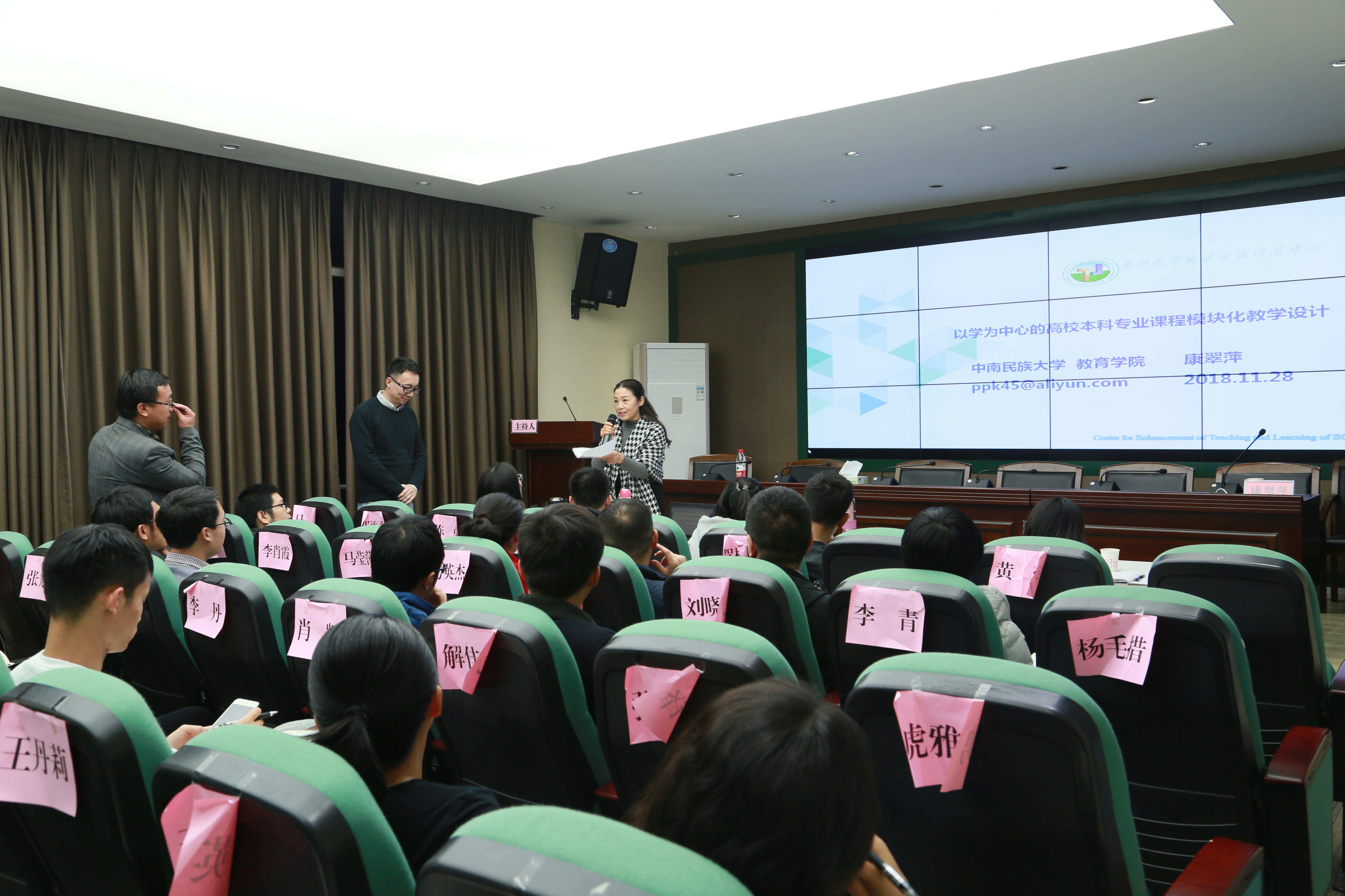 中南民族大學(xué)教授康翠萍以《以學(xué)為中心的高校本科專業(yè)課程模塊化教學(xué)設(shè)計》為主題作輔導(dǎo)報告。她從教學(xué)設(shè)計與教材、教學(xué)大綱的關(guān)系,教學(xué)內(nèi)容與教材的關(guān)系,專業(yè)課程的目標(biāo),教學(xué)設(shè)計的因素等問題為切入點,結(jié)合自己承擔(dān)的本科專業(yè)課程模塊化教學(xué)改革情況、教學(xué)設(shè)計和教學(xué)效果,與大家進行了充分討論、交流,分享了自己的經(jīng)驗。