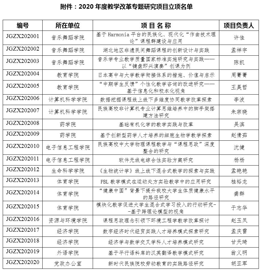 根據(jù)《關(guān)于組織開展2020年度教學(xué)改革專題研究項(xiàng)目申報(bào)工作的通知》要求,經(jīng)各學(xué)院推薦、教師教學(xué)發(fā)展中心組織校內(nèi)外專家評審,“基于Harmonia平臺的民族化、現(xiàn)代化‘作曲技術(shù)理論’課程群建設(shè)與應(yīng)用”等項(xiàng)目立項(xiàng)為“2020年度教學(xué)改革專題研究項(xiàng)目”(見附件),現(xiàn)予以公布。 請各項(xiàng)目組嚴(yán)格按照《中南民族大學(xué)教師教學(xué)發(fā)展中心教學(xué)改革專題研究項(xiàng)目管理辦法》(見http://www.arabd1.xyz/s/270/t/1600/8f/59/info102233.htm)有關(guān)規(guī)定積極開展項(xiàng)目研究。