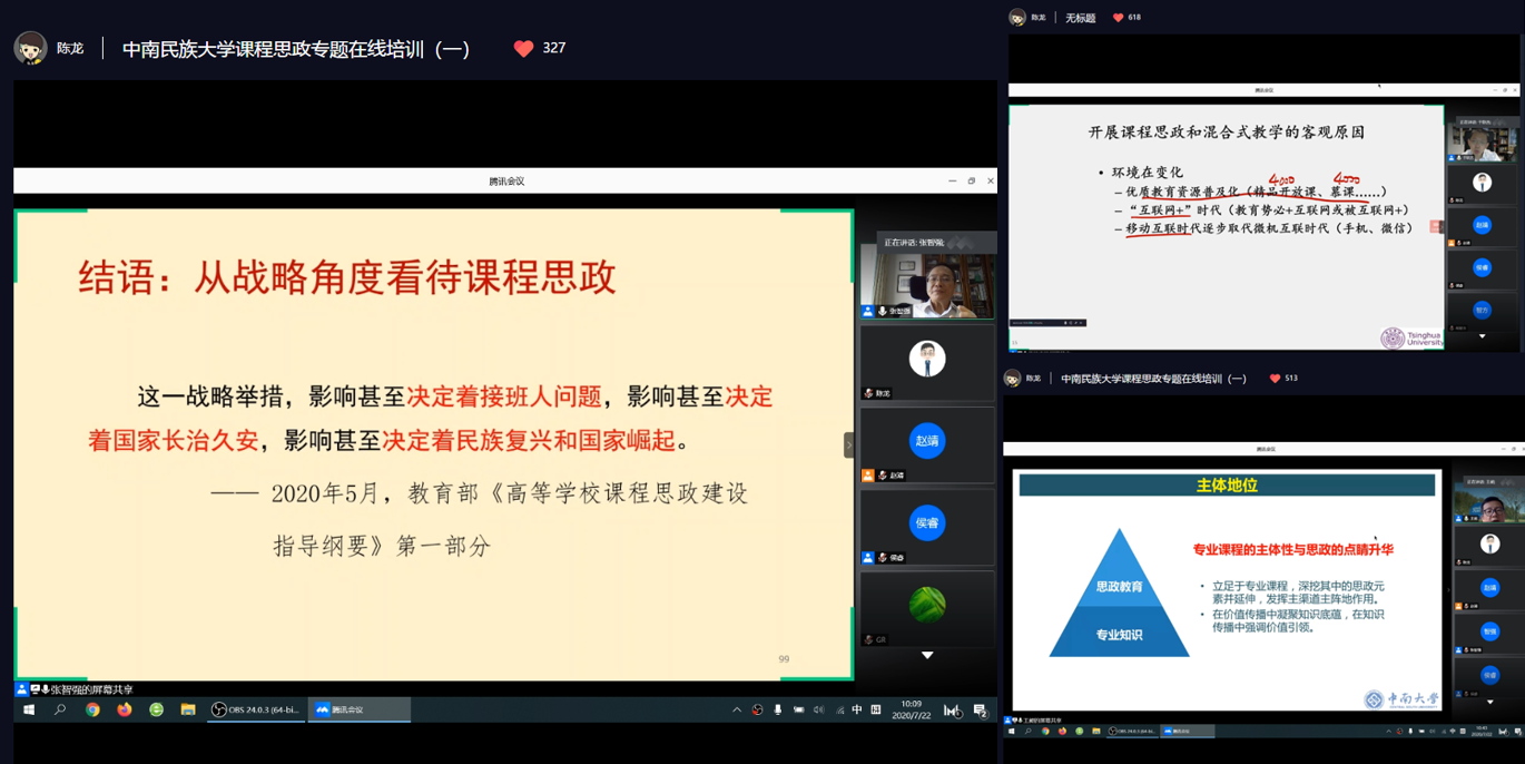 為貫徹落實(shí)教育部《高等學(xué)校課程思政建設(shè)指導(dǎo)綱要》精神,全面推進(jìn)課程思政建設(shè),7月22日,教師教學(xué)發(fā)展中心開(kāi)展了“課程思政專題在線培訓(xùn)(一) ”,來(lái)自全國(guó)近60所院校的500余名教師參加了此次線上活動(dòng)。本次活動(dòng)由中心副主任侯睿主持。 培訓(xùn)特邀到上海中醫(yī)藥大學(xué)張智強(qiáng)教授、中南大學(xué)王昶教授以及清華大學(xué)于歆杰教授,分別圍繞思政教育資源的發(fā)掘、課程思政教學(xué)設(shè)計(jì)、混合式教學(xué)與課程思政等內(nèi)容進(jìn)行了全面而詳盡的講解。張智強(qiáng)教授結(jié)合上海中醫(yī)藥大學(xué)、復(fù)旦大學(xué)、上海應(yīng)用技術(shù)大學(xué)等高校優(yōu)秀典型課程思政案例,幫助教師們理解專業(yè)教學(xué)中的“思政”,從專業(yè)、課程、章節(jié)中發(fā)掘思想政治元素。王昶教授以其戰(zhàn)略管理課程為例,闡述了“理論學(xué)習(xí)、案例分析、思政升華——三位一體”的課程思政教學(xué)模式設(shè)計(jì)與實(shí)施。于歆杰教授從“正確認(rèn)識(shí)課程思政”、“工科課程開(kāi)展課程思政”等方面詳細(xì)介紹了混合式教學(xué)模式下如何真正實(shí)施課程思政。 培訓(xùn)結(jié)束后的問(wèn)卷調(diào)查結(jié)果顯示,教師們通過(guò)本次專題在線學(xué)習(xí)進(jìn)一步理解了課程思政的內(nèi)涵,明確了課程與思政之間的關(guān)系,明晰了課程思政教學(xué)模式,并深入了解了如何在混合式教學(xué)中實(shí)施課程思政。 后期,中心會(huì)繼續(xù)開(kāi)展課程思政系列專題培訓(xùn)活動(dòng),以切實(shí)提高教師“課程思政”育人能力,更好地推進(jìn)各類課程與思想政治理論課同向同行。