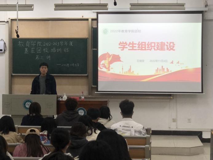為提高基層團員素質,強化團員的政治品格。教育學院于11月4日中午在15棟220舉行了第三次基層團校培訓課,本次團課的主講人為王繼發老師,團課主題為“學生組織建設”。
