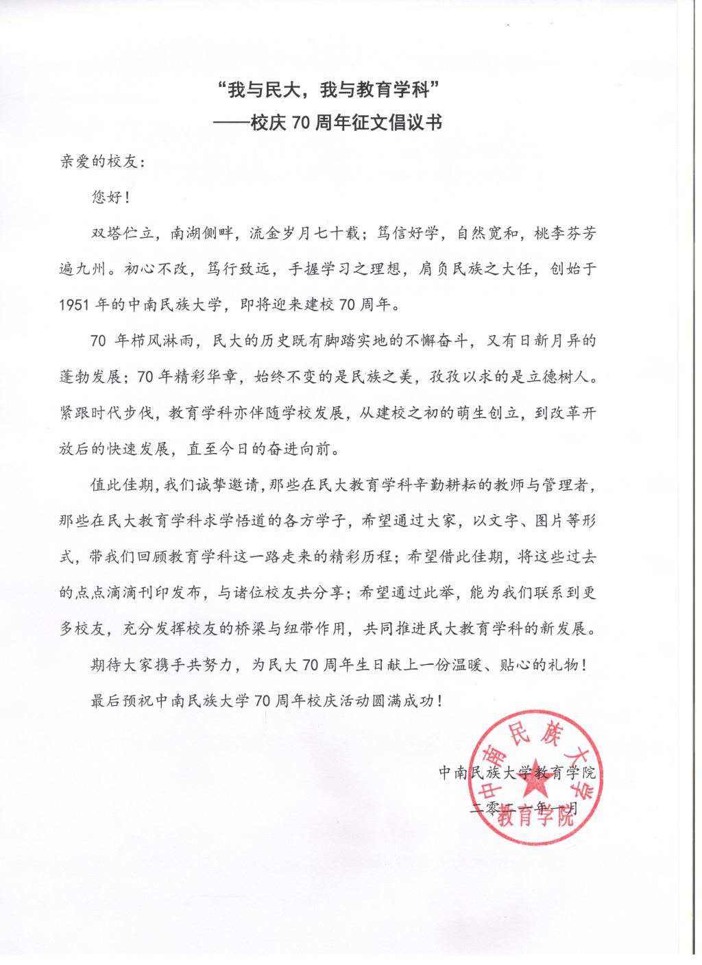 “我與民大,我與教育學科” ——校慶70周年征文倡議書