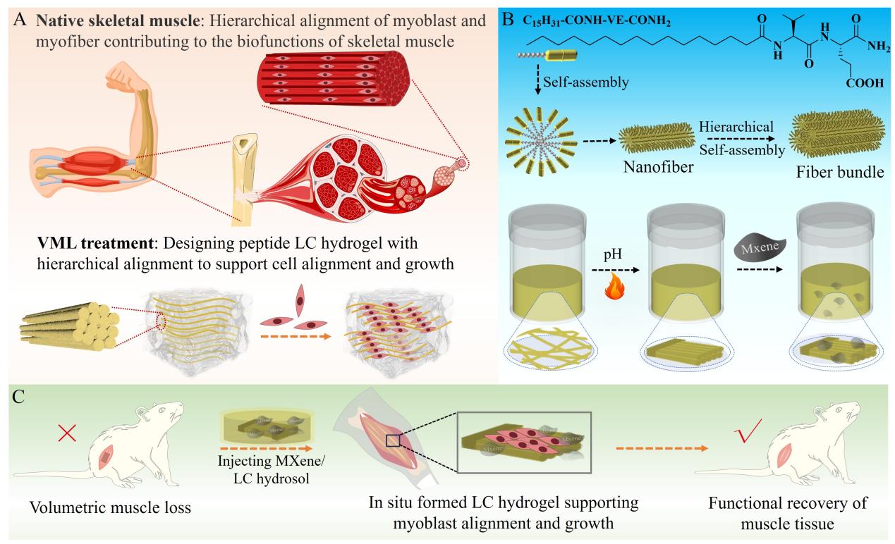 近期,我校秦四勇教授、黃蓉副教授團隊在《Advanced Functional Materials》上發(fā)表論文《Injectable Peptide Liquid Crystal Hydrogel with Hierarchical Microstructure Directs Myoblast Alignment and Potentiates Muscle Functional Recovery》(Adv. Funct. Mater. 2025, e00204)。該論文創(chuàng)新性地制備了一種可注射的自組裝肽液晶(LC)水凝膠,其具有分層纖維排列結(jié)構(gòu),可有效支持骨骼肌再生。為模擬骨骼肌的物理化學功能,將二維碳化鈦納米片MXene作為外源成分引入LC水凝膠,顯著增強了水凝膠的機械強度、抗炎活性和電導(dǎo)率。所得的Ti3C2Tx/LC水凝膠能夠有效引導(dǎo)成肌細胞有序排列,促進成肌分化與血管生成。與無序排列的非液晶(NLC)水凝膠相比,具有分層結(jié)構(gòu)的排列Ti3C2Tx/LC水凝膠在大鼠VML模型中,能夠顯著促進新肌肉組織的形成,并推動肌肉功能恢復(fù)。本研究為制備有序排列的水凝膠支架提供了一種高效且實用的策略,在肌肉組織工程和再生醫(yī)學領(lǐng)域展現(xiàn)出巨大的應(yīng)用潛力。
