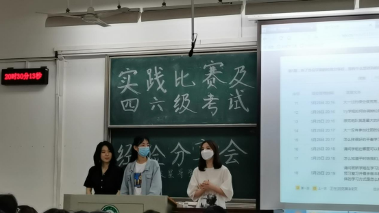 本站訊(通訊員冉賽男 萬霄羽 攝影李雨昕)5月28日晚18:40,我院極星導(dǎo)生團(tuán)隊于11號教學(xué)樓207開展了實踐、比賽及四六級考試經(jīng)驗分享會。本次分享會旨在聚焦同學(xué)們實踐能力鍛煉,提高同學(xué)們對社會實踐及各類比賽的了解,學(xué)習(xí)英語四六級備考方法和期末備考技巧,提高自身能力,以便于更從容地面對考試,提高同學(xué)們的綜合素質(zhì),促進(jìn)其全面發(fā)展,濃厚全院的學(xué)習(xí)氛圍。此次活動邀請了18級廣告學(xué)專業(yè)王靈通,18級廣播電視學(xué)專業(yè)王雪嬌和18級漢語言文學(xué)專業(yè)唐若妍分享自己的比賽經(jīng)驗以及備考各類證書的經(jīng)驗,為準(zhǔn)備參加各類比賽的20級學(xué)生傳授經(jīng)驗,指明方向。