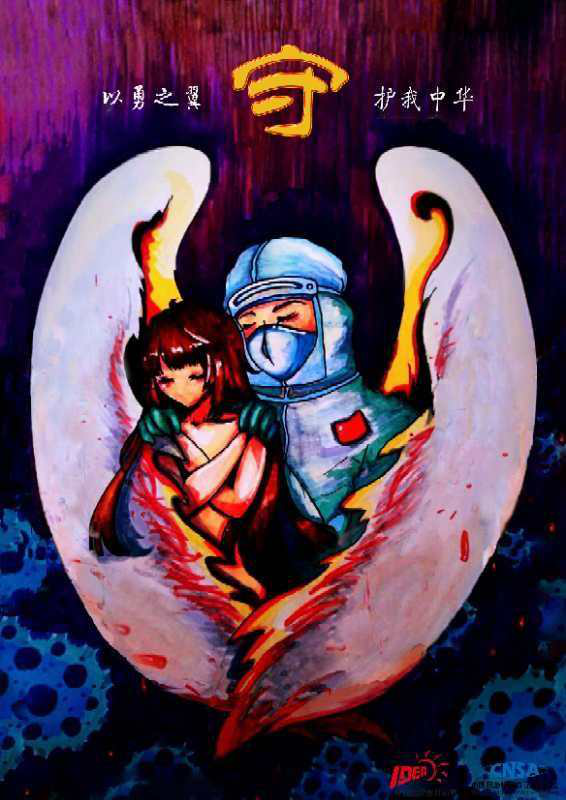 申雨心和易江南同學創作的《守》是想體現醫者的“守護”。這一想法源自易江南同學的生活經歷:“我叔叔是醫生,他在我們城市的醫院工作,春節不能回家。想到武漢肯定有很多這樣奮戰在一線的醫護人員,我們的平安是有他們在守護,所以就畫了這樣一幅畫。” 守是會意字,宀表示房屋,寸在古代又是“手”的意思,結合自己的專業知識,易江南把醫生的“守護”更加具象化,化“宀”為醫護人員的翅膀,“寸”即是醫護人員的手,也代表著堅持。而作品中的少女不僅是患者的具象,也代表了美好,象征著希望,易江南認為醫者要守護的不僅僅是病患,還有人們的希望。同時黃色的“守”字也象征著光源,“背景是暗的,但我們還有光,醫護人員的守護就是光,也是希望”。