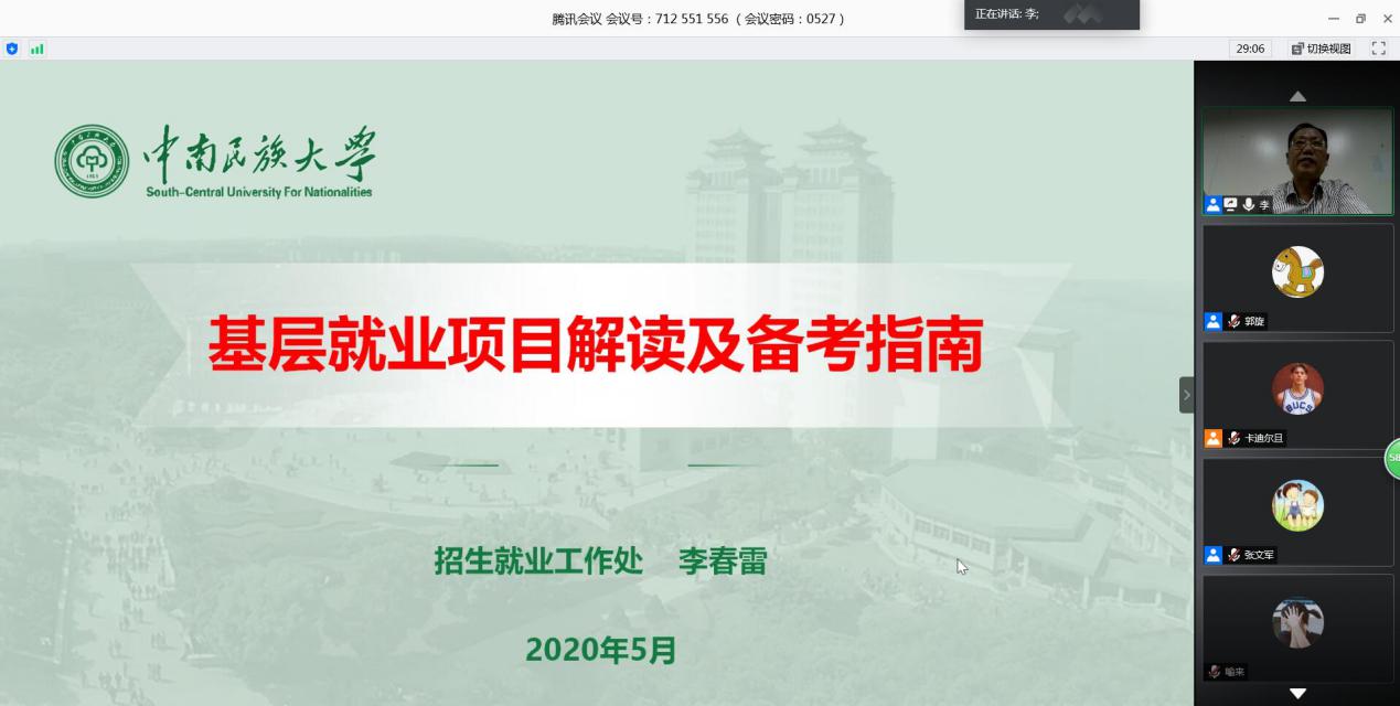 為推動疫情下畢業生畢業就業工作順利完成,2020年5月27日19:00,我院邀請招生就業工作處副處長李春雷對基層就業項目進行解讀及政策宣講,學院黨委副書記張文軍、2016級輔導員郭旋、卡迪爾旦、以及百余名2016、2017級學生通過線上參與了此次會議。會議由張文軍主持。